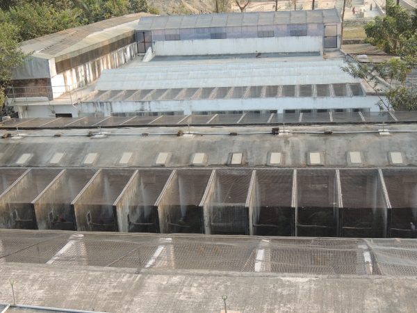Every aviculturist tries to provide the best means of exercise for their birds. Dr Banerjee showed me cages with the front perch at eyelevel. The rear perch was at waist level. I had always thought that perches at the same level, one at the front and the other at the rear of the cage, allowed maximum flight cage, but I was wrong. I watched how a pairs of Crimson-bellied Conures Pyrrhura perlata perlata flew down and up, the total flight space being greater by a third. The birds were actually flying more than the cage space allowed. The macaws have cement nest boxes which they must access by flying literally a half circle, as the nests are constructed in the shelter but away from the passageway. The macaws used every muscle in their body to fly from the outside perch and then do a semi circle to reach their nests. This resulted in birds with exceptional muscular development.
