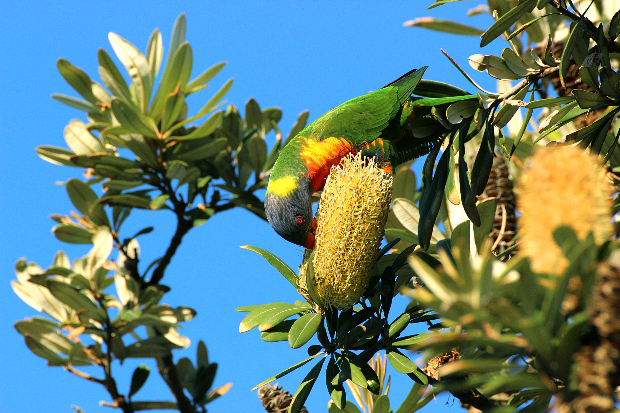 Australian King Parrot feeding on the seeds of Coastal Wattle (Acacia longifolia). (c) Doug Beckers. This file is licensed under the Creative Commons Attribution-Share Alike 2.0 Generic license (https://creativecommons.org/licenses/by-sa/2.0/deed.en).